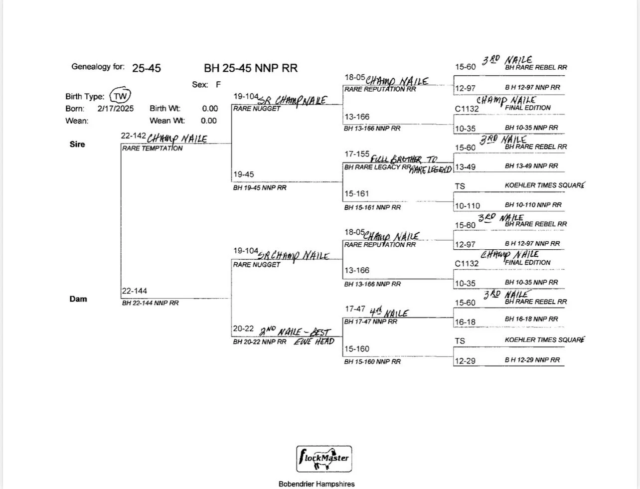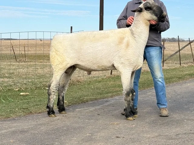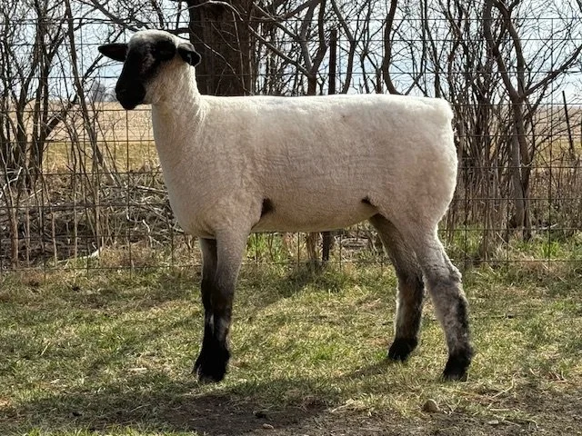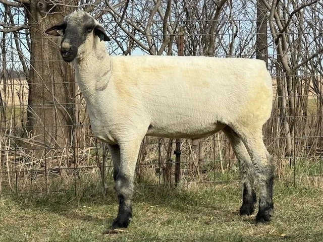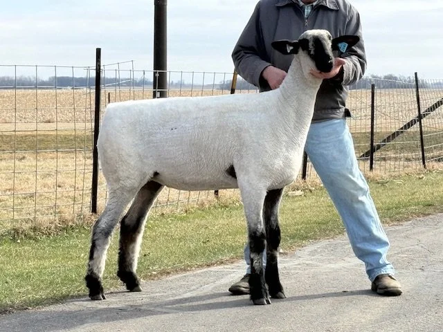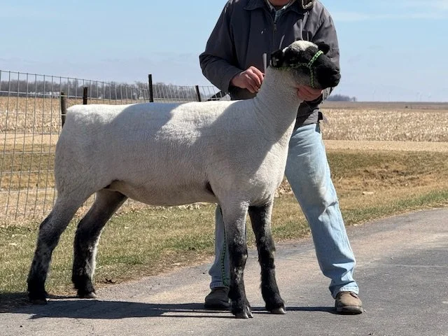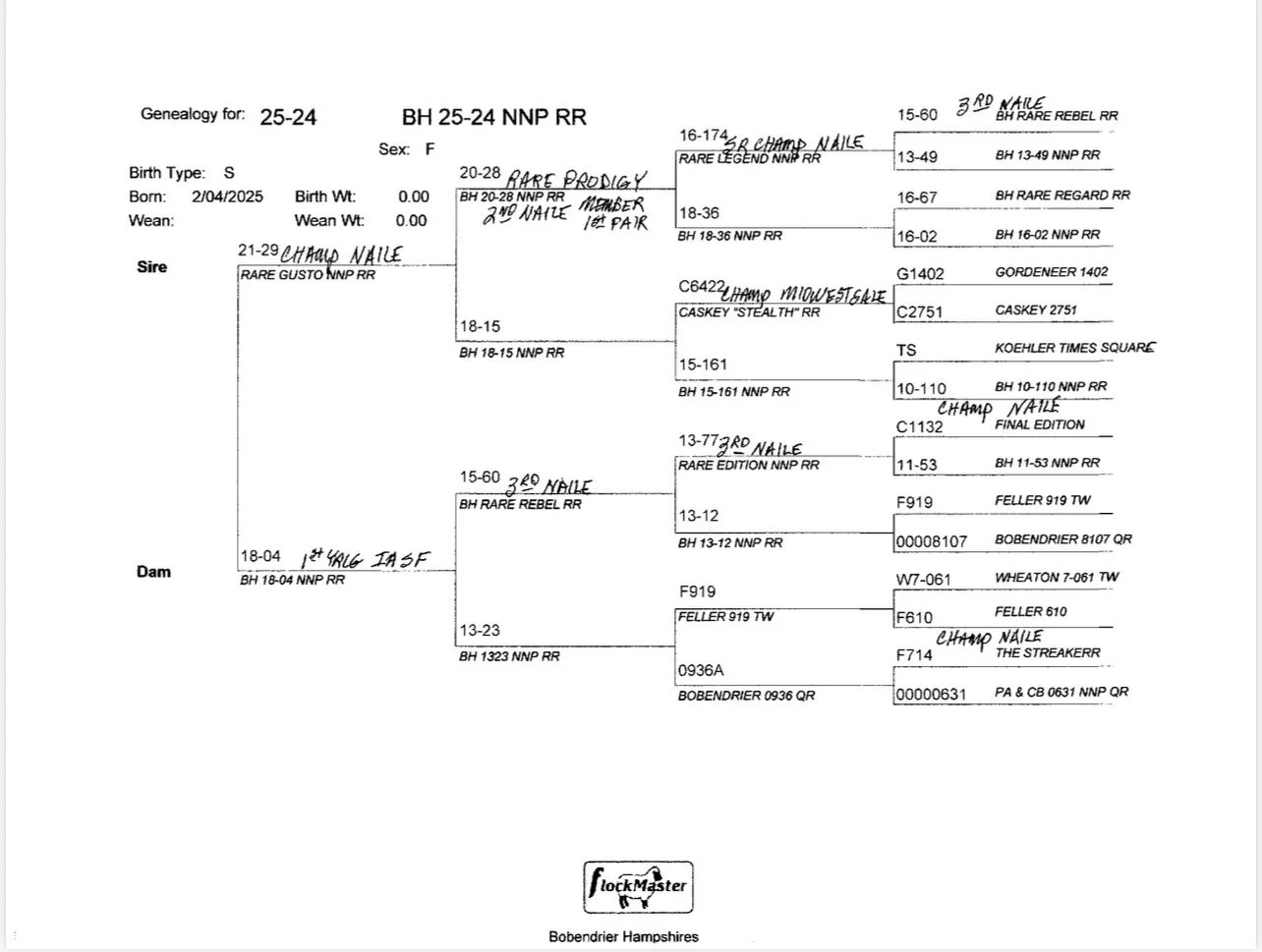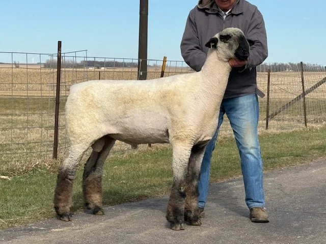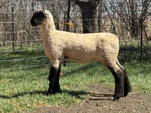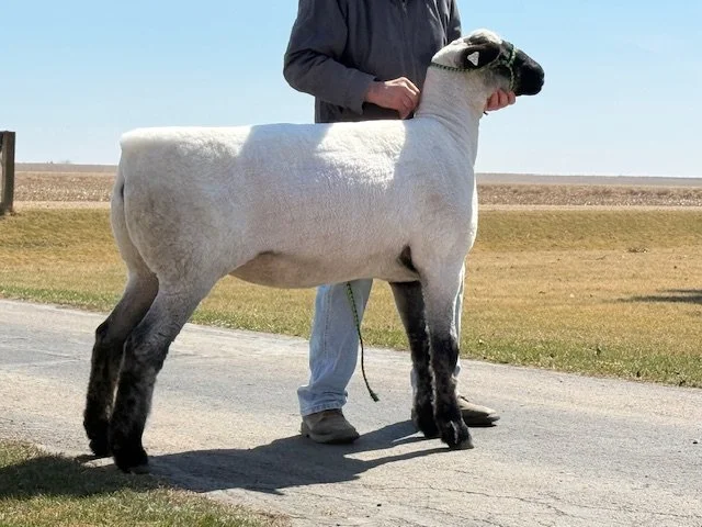 This young ewe was born a triplet out of a show yearling ewe and our lead "Rare Nugget" son in our 2024 crop. Check out all the National winners in her impressive pedigree. She has beautiful Hampshire type and is from an incredibly strong maternal line. All of the females on the bottom line of her pedigree consistently show up on the papers of our show flocks each year. Her triplet sister is staying home!