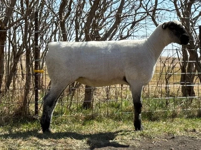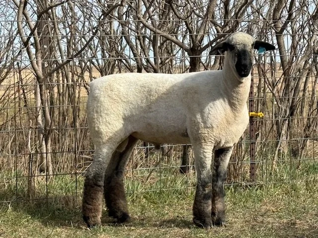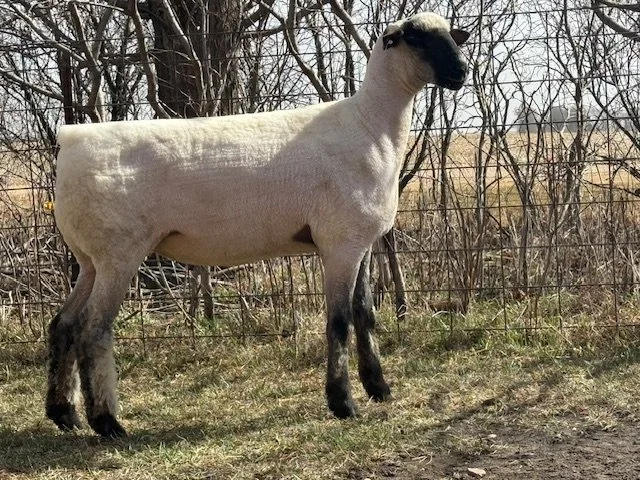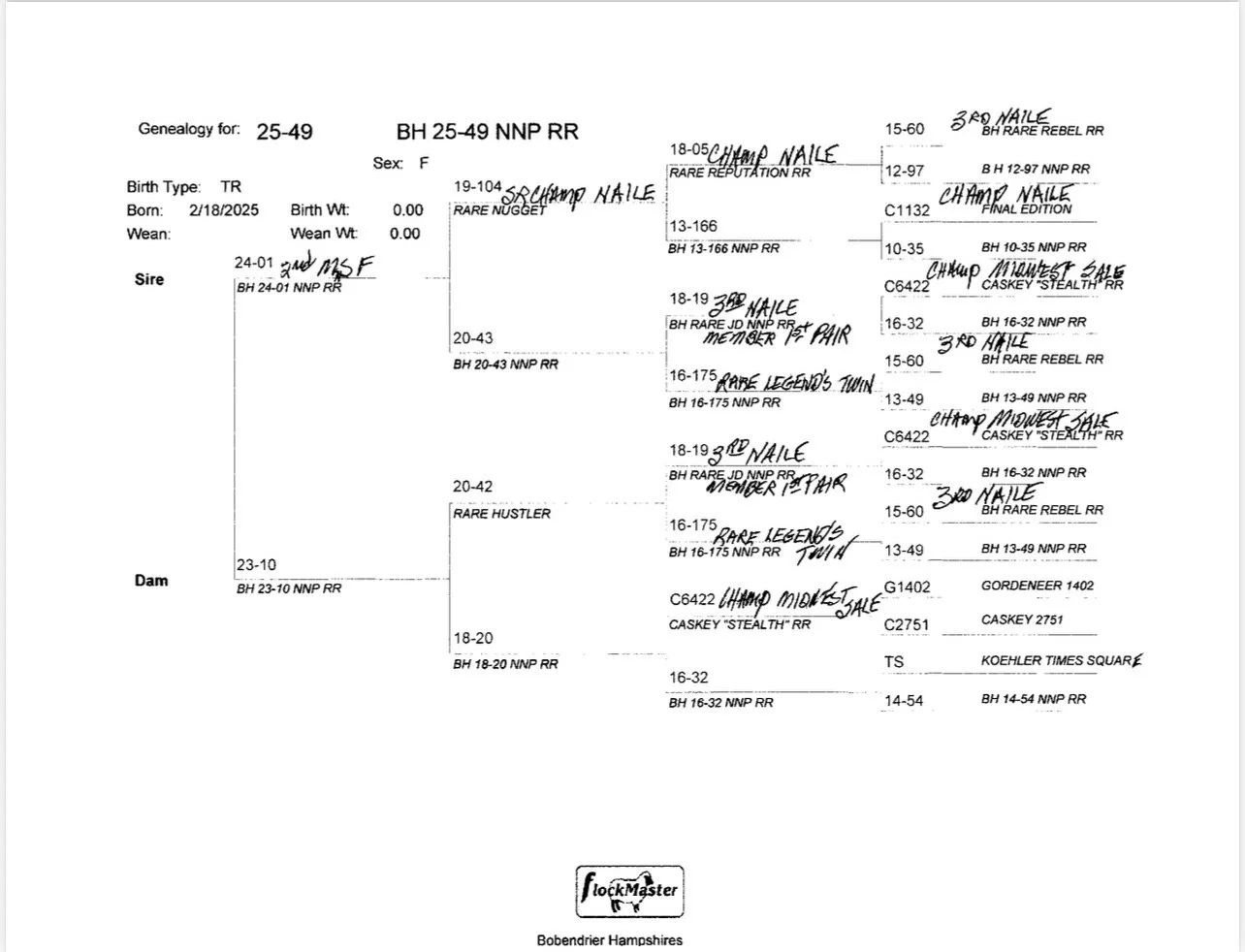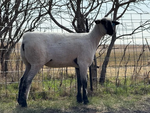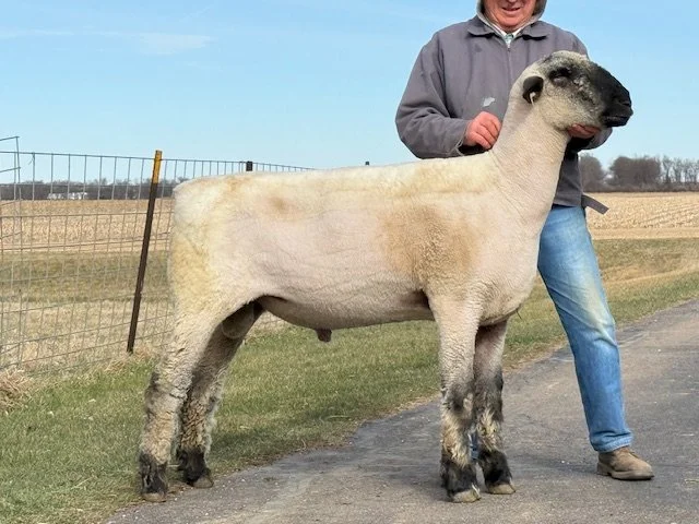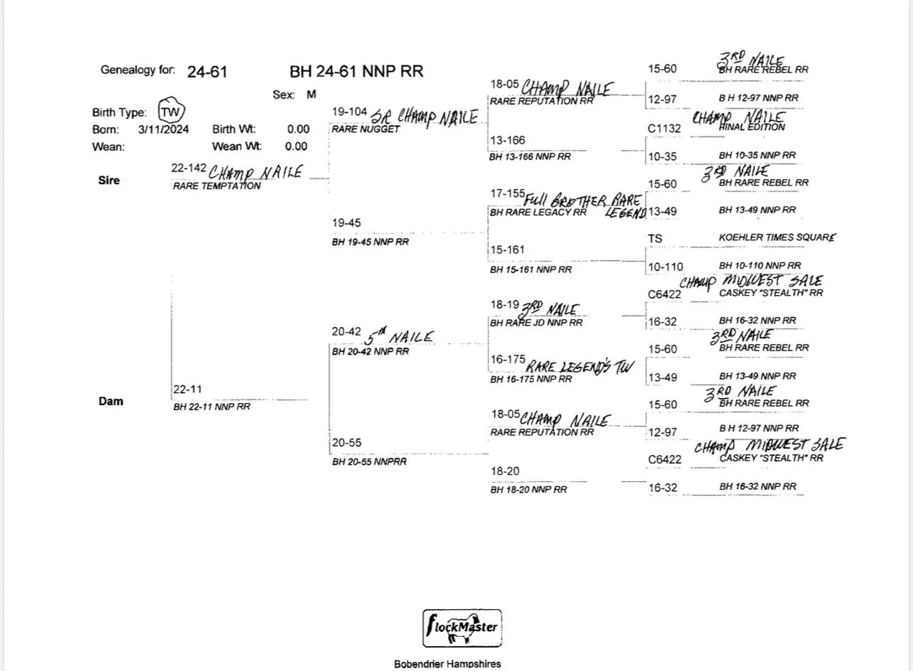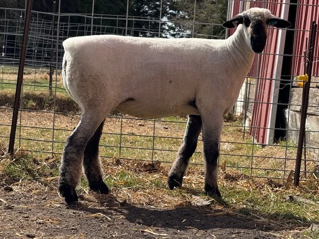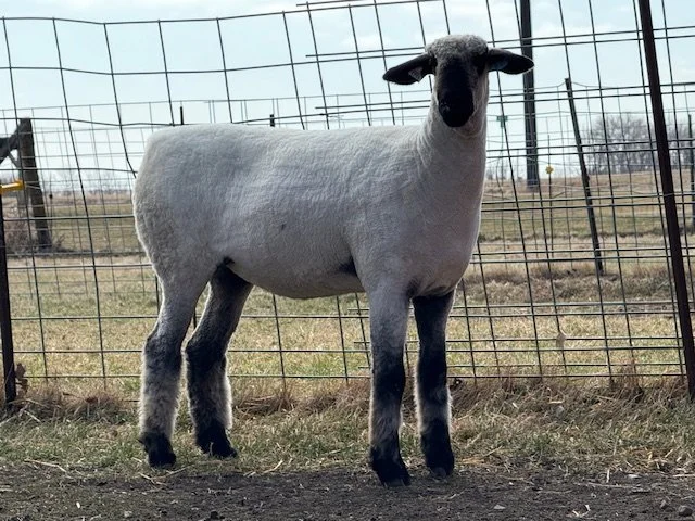 This young ewe was born a triplet out of a show yearling ewe and our lead "Rare Nugget" son in our 2024 crop. Check out all the National winners in her impressive pedigree. She has beautiful Hampshire type and is from an incredibly strong maternal line. All of the females on the bottom line of her pedigree consistently show up on the papers of our show flocks each year. Her triplet sister is staying home!