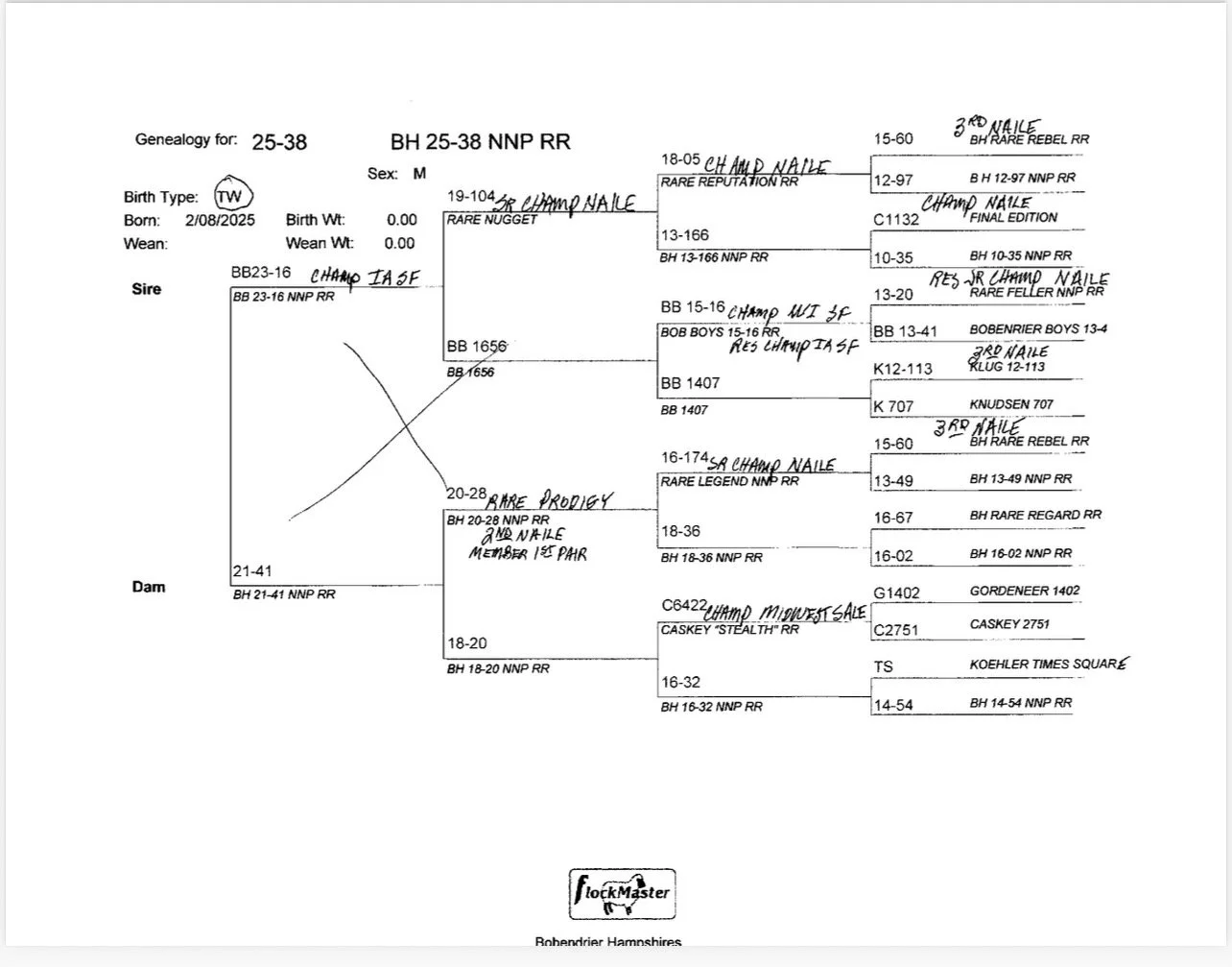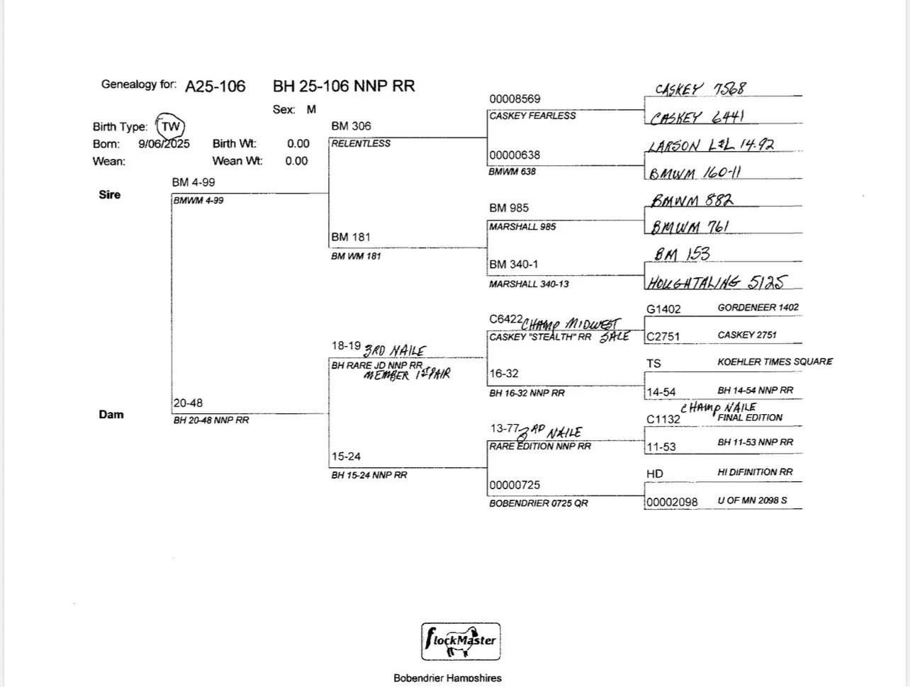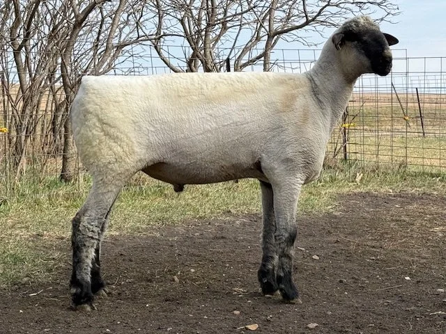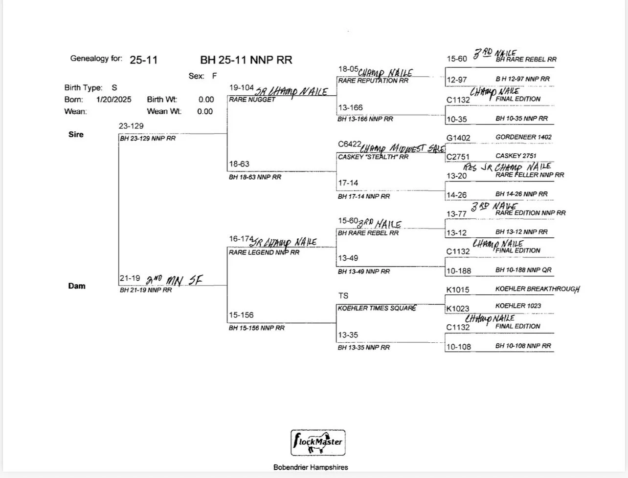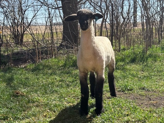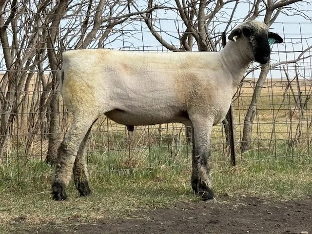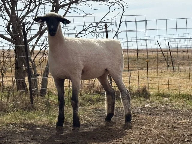 This young ewe was born a triplet out of a show yearling ewe and our lead "Rare Nugget" son in our 2024 crop. Check out all the National winners in her impressive pedigree. She has beautiful Hampshire type and is from an incredibly strong maternal line. All of the females on the bottom line of her pedigree consistently show up on the papers of our show flocks each year. Her triplet sister is staying home!