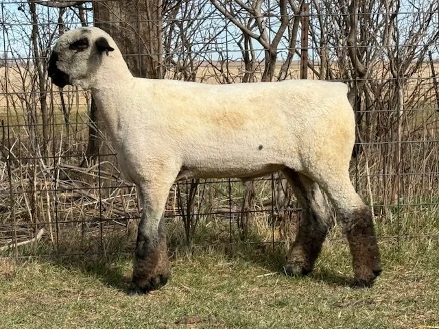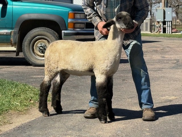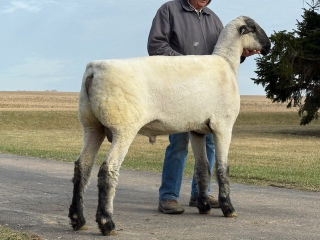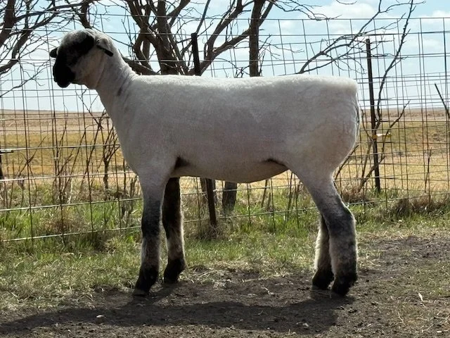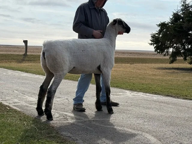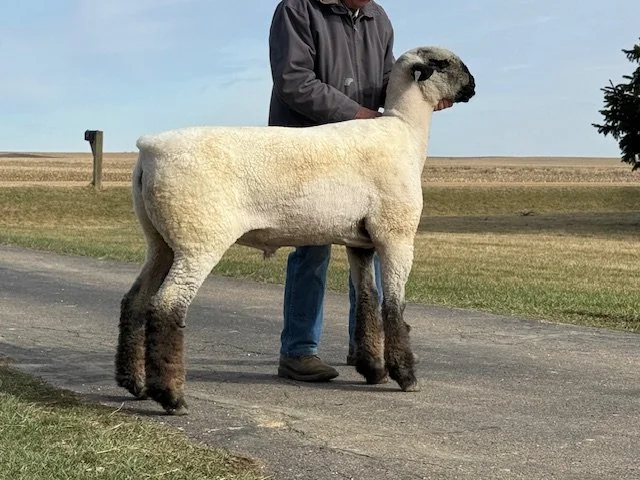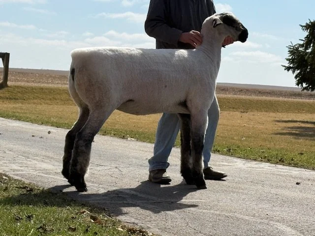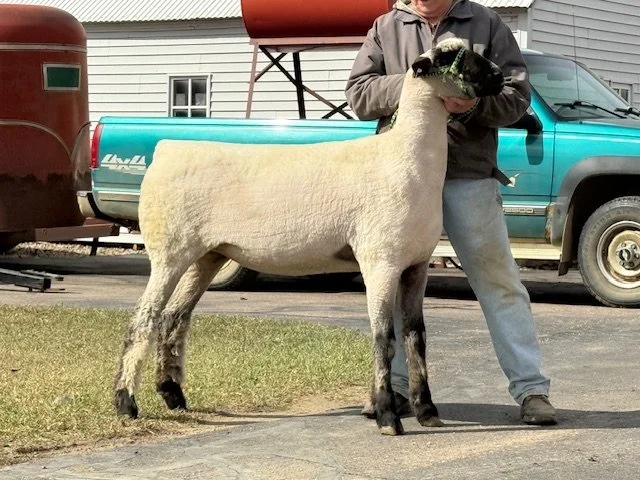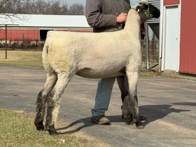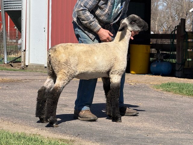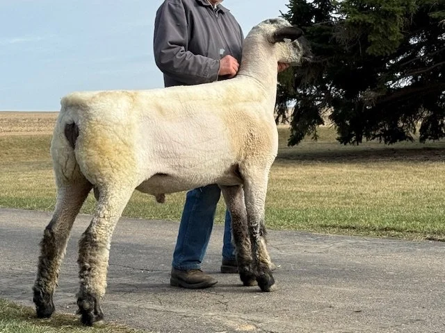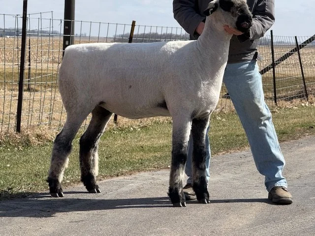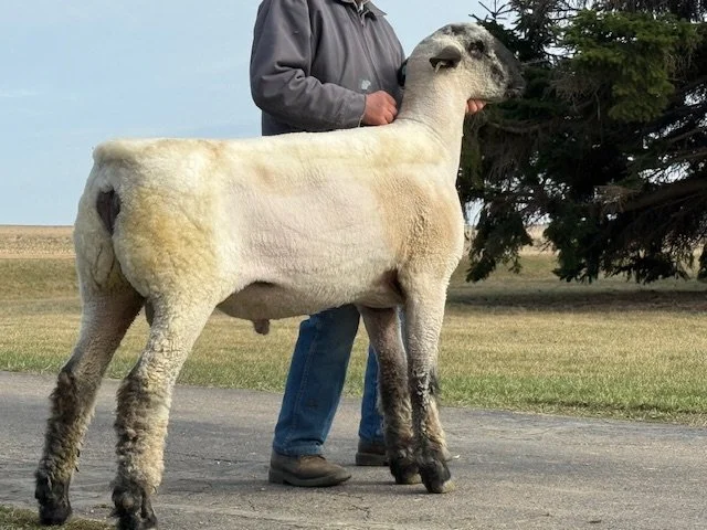 Here's the eye catcher of the group! Watching her parade around the lot every day makes it really fun to do chores! She's extra-long bodied with great front extension and carries herself around with great distinction. She has very little wool on her and will continue to grow, as these "Rare Gusto" daughters are of the later maturing kind. This one is capable of running with the best at any level of competition. Really had to part with this kind. Her mother was a class winning yearling at the IA State Fair and her sire was undefeated National Champion in 2022.
