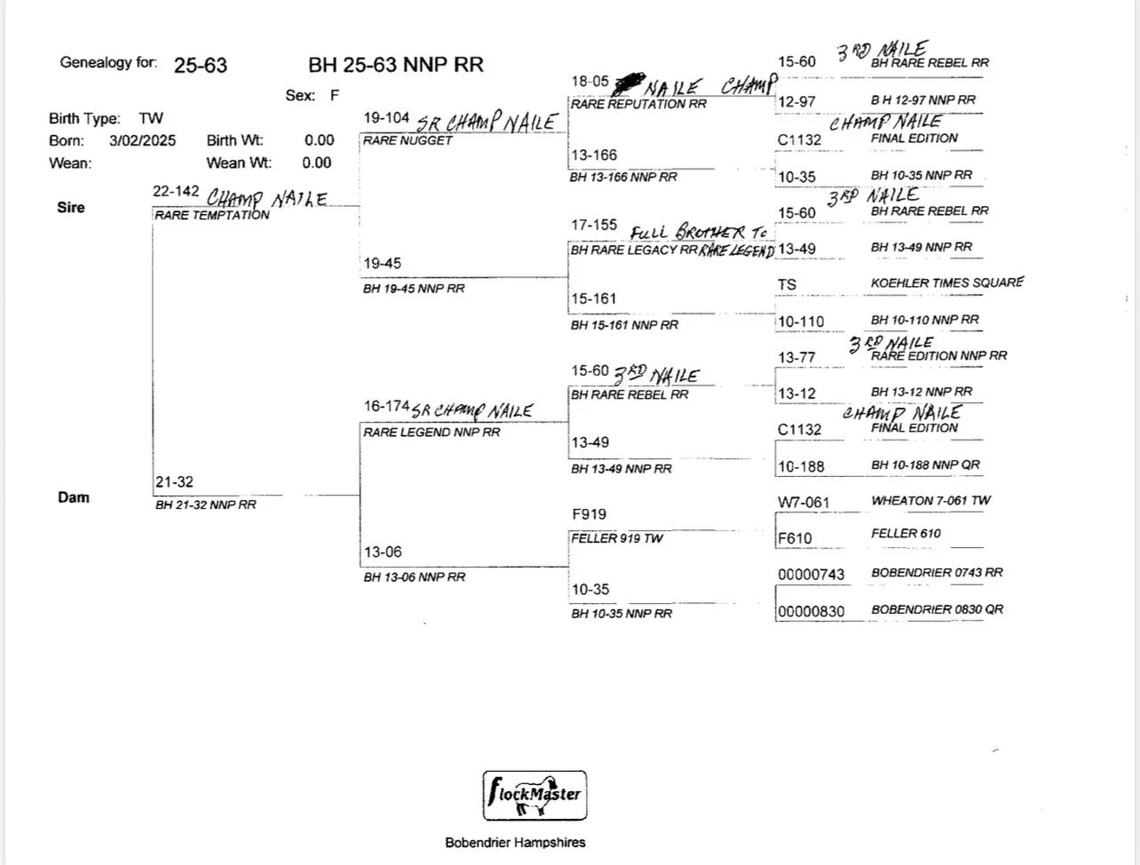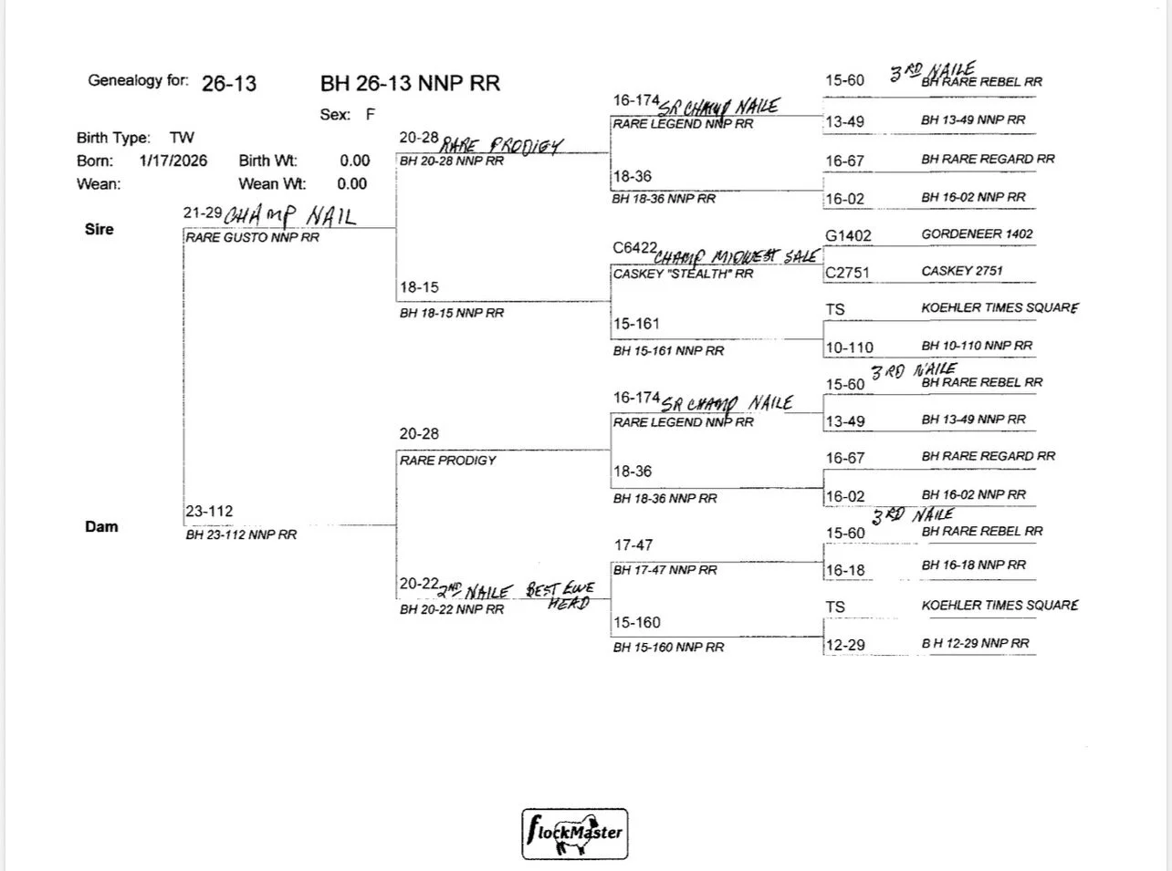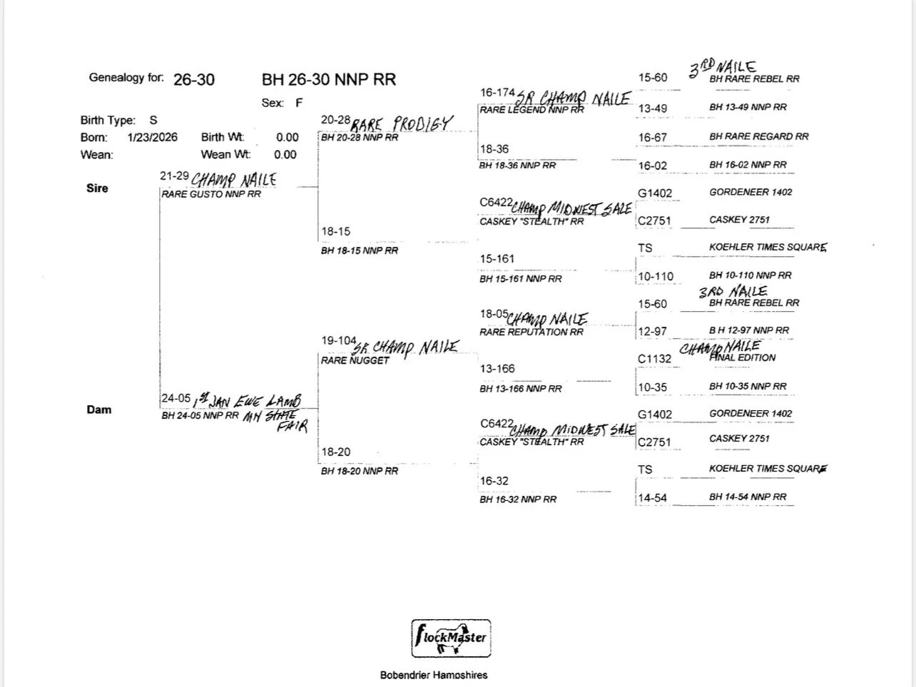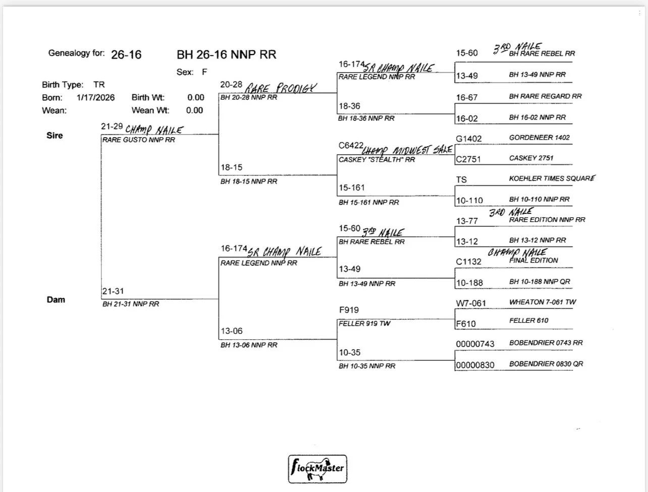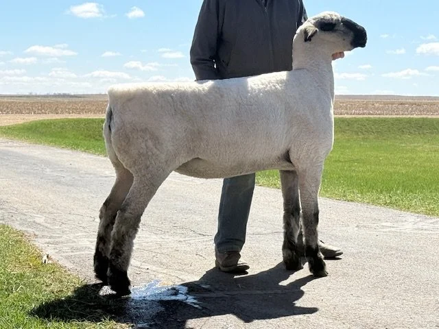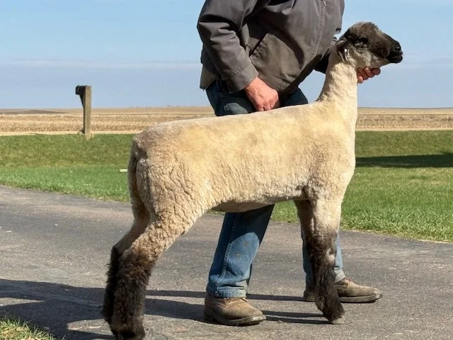 A really sharp, eye-catching lamb on the move sired by National Champion "Rare Gusto". She has a beautiful profile with great front extension and has a flawless set of feet and legs while exhibiting really nice hampshire breed type._Her dam was 1st place January lamb at the MN state fair open show and all of the grand dams on the bottom of her pedigree appear in the majority of our show flock's ancestry each year._